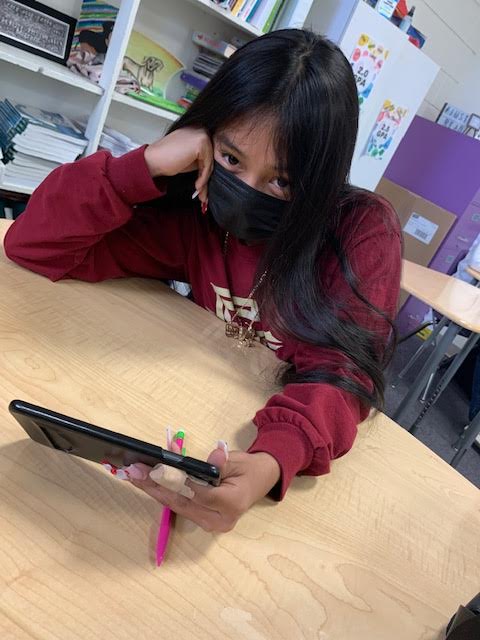 HERE IS A PICTURE OF SINTHA RIVERA WATCHING YOUTUBE. ”Some of the videos I like to watch are on YouTube, one of them that I like to watch on there is Squid Game,” Rivera said.