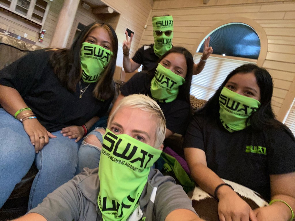 SWAT members smile for a picture as they prepare for their upcoming meeting. They showed off SWAT spirit by wearing club merchandise.