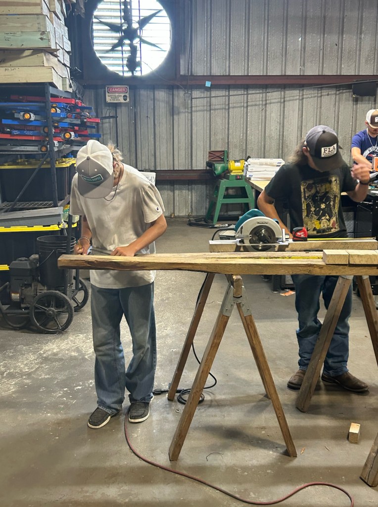 Cayden Danley and Kason Lemmerman cutting wood for AG Mechanics.