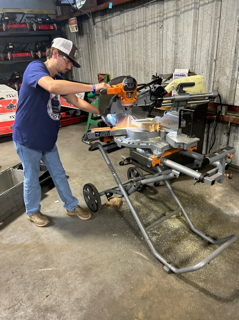 A student in Clinton Thompson’s AG Mechanics class cuts wood with heavy machinery.