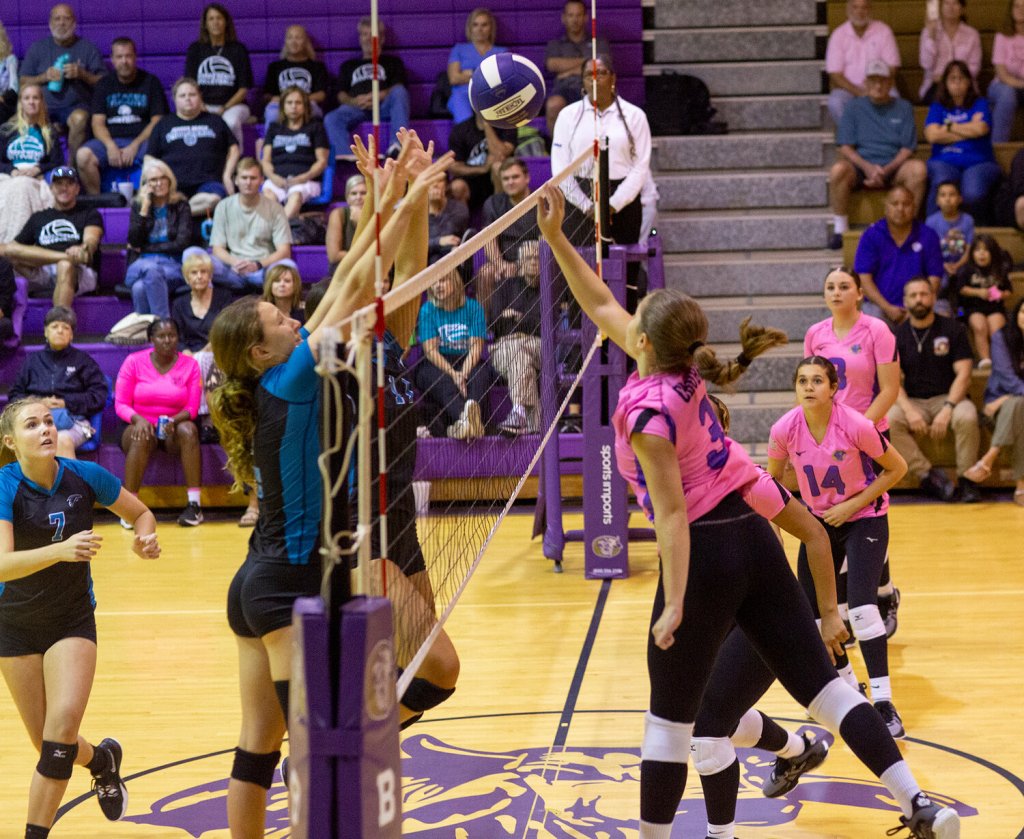 Penelope Van Eman tipping on Jensen beach. The blockers go up to block as Penelope does approach.