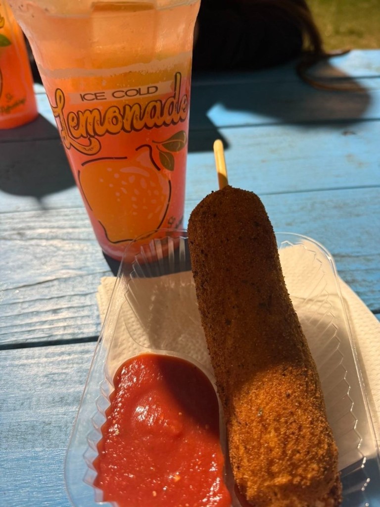 A corn dog is a simple and delicious snack that many people enjoy. It has a hot dog covered in a thick layer of cornmeal batter and then fried until golden brown. The outside is crispy, while the inside stays soft and warm. It tastes even better when dipped in ketchup or mustard. Many people like to eat corn dogs at fairs, parks, or sporting events. They are easy to hold and fun to eat because they are served on a stick. A cold lemonade is a perfect drink to have with it. The sweet and sour flavor of lemonade balances the salty taste of the corn dog. Together, they make a tasty and satisfying meal.