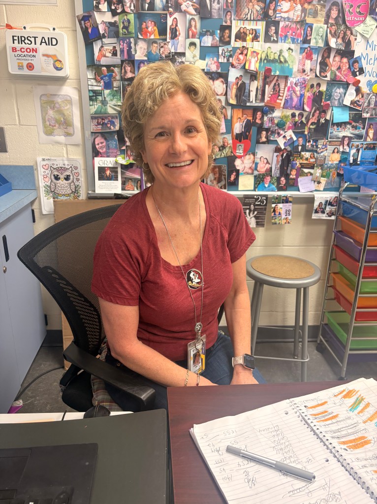 Frances Mckee is a Algerbra 2 math teacher. She went to the University of Central Florida and IRSC. Mckee went to school for four years and has a math education degree. She chose to teach math because “the lord showed me I was good at math, even if I had to struggle at times, but I also like people, that’s why I’m teaching math,” said Mckee.
