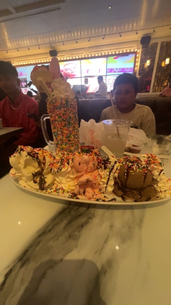 The Sugar Factory King Kong Sundae is a massive dessert made for up to 12 people. It features 24 scoops of ice cream in flavors like chocolate, vanilla, and strawberry. The platter is packed with baked goods including a cupcake, a glazed donut, and chocolate chip cookies. It is covered in toppings like hot fudge, caramel, strawberry sauce, and toasted marshmallows. For a colorful crunch, it includes candies like M&M’s®, Skittles®, gummy bears, and Oreo® crumbles. The entire treat is finished with whipped cream, candy necklaces, and gummy cherries. It is typically priced around $99 and often served with lit sparklers for a fun celebration. This extravagant sundae is a viral favorite at Sugar Factory locations worldwide. “This will be too much for me,” Daniel Rojas (10).